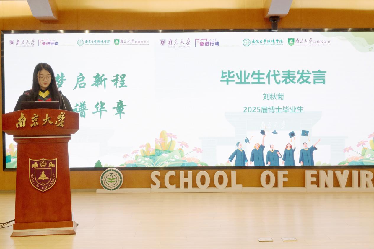 2025届博士毕业生刘秋菊作为毕业生代表发言。她表示在读期间受益于澳门博彩官网 宝贵资源和平台,钻研专业知识,锻炼科研能力,不断拓宽视野,为生态文明建设贡献力量。未来也将继续努力,厚植家国情怀、涵养进取品格,以奋斗姿态激扬青春,在全面推进美丽中国建设中挺膺担当。