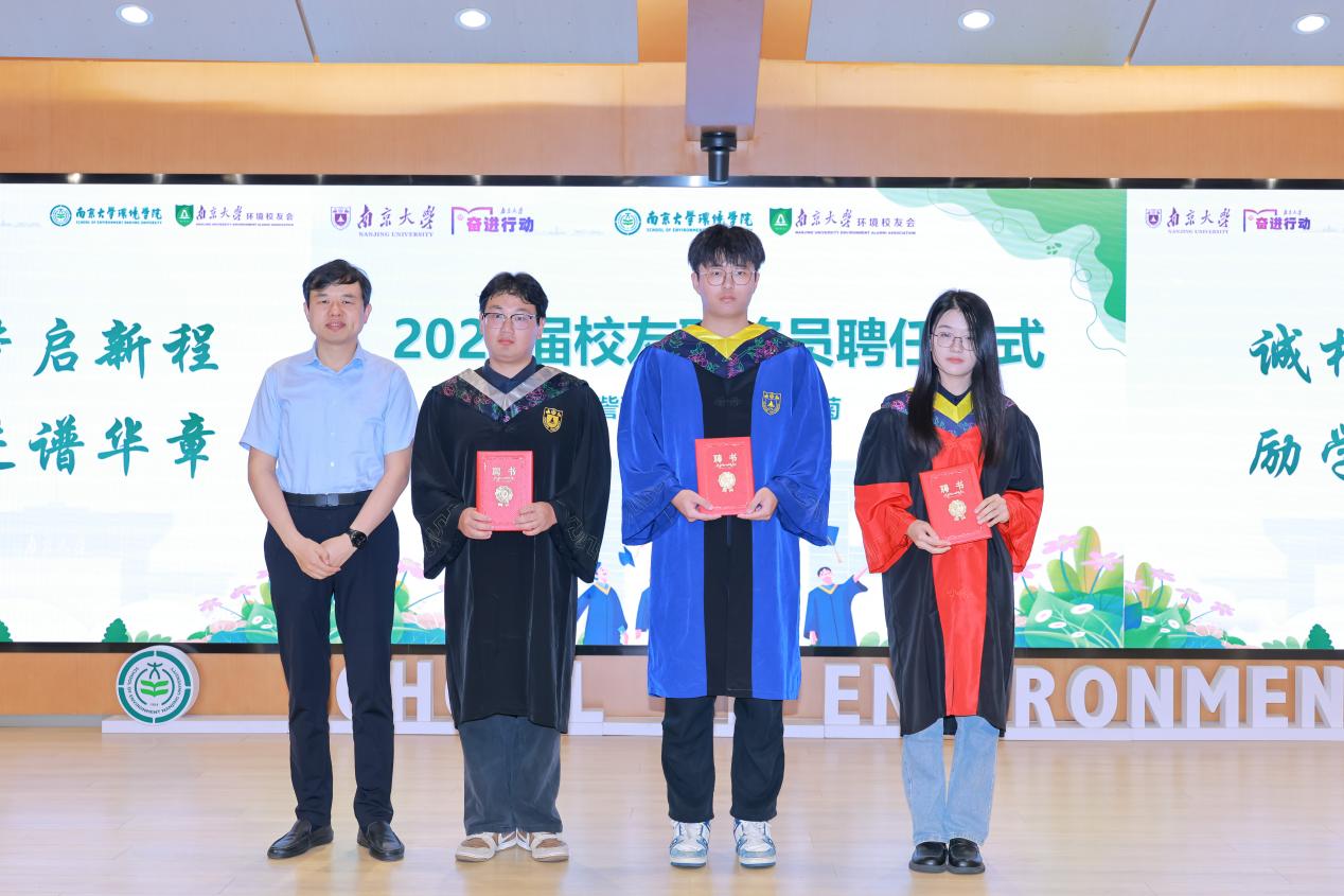 李良向全体毕业生介绍环境校友会发展概况与工作成绩,校友会以服务校友、服务学校、服务社会为宗旨,全面助推毕业生发展,是校友们紧密联系、互动交流的广阔平台和温暖港湾,也欢迎各位毕业生加入校友会。陆朝阳为2025届校友联络员訾游、吴泽涛、刘秋菊颁发聘书。