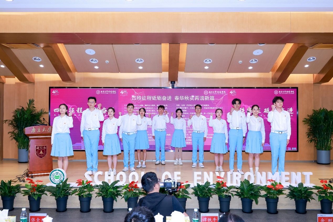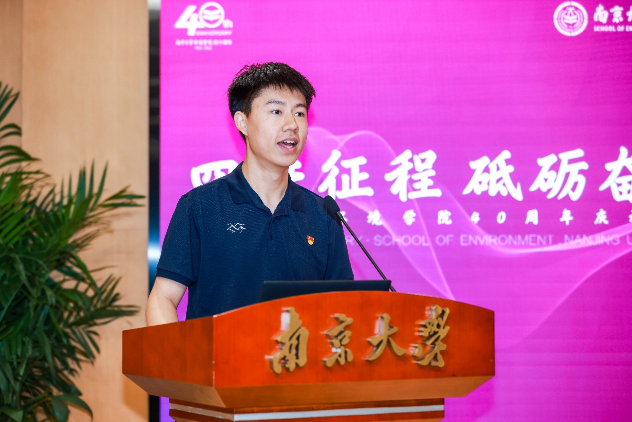 学生代表朱博阳分享了从本科到研究生阶段的学习经历和感受。他表示,学校和澳门博彩官网 给学生们提供求知求学的广阔平台,让学生们在思想情操、意志品行、专业知识、实践能力等方面都收获了成长。作为一名南大环境人,将坚决贯彻落实习近平总书记"报效国家、服务人民"的核心要求,时刻牢记"再创佳绩、争做表率"的殷切期望,争先实干,砥砺奋进,为我国生态文明事业和美丽中国建设贡献青春力量。